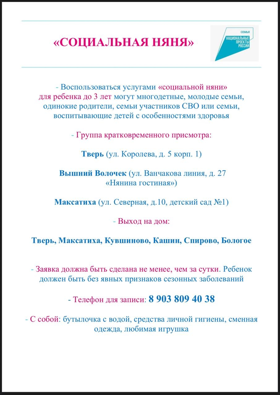 В рамках реализации национального проекта "СЕМЬЯ" с 1 января 2025 года в Тверской области начали действовать новые меры поддержки для семей, в том числе в июле 2025 года в Тверской области стартовала мера поддержки услуги "социальной няни"для детей до 3 лет из определенных категорий семей (Тверь, Максатиха,Кувшиново, Кашин, Спирово, Бологое)