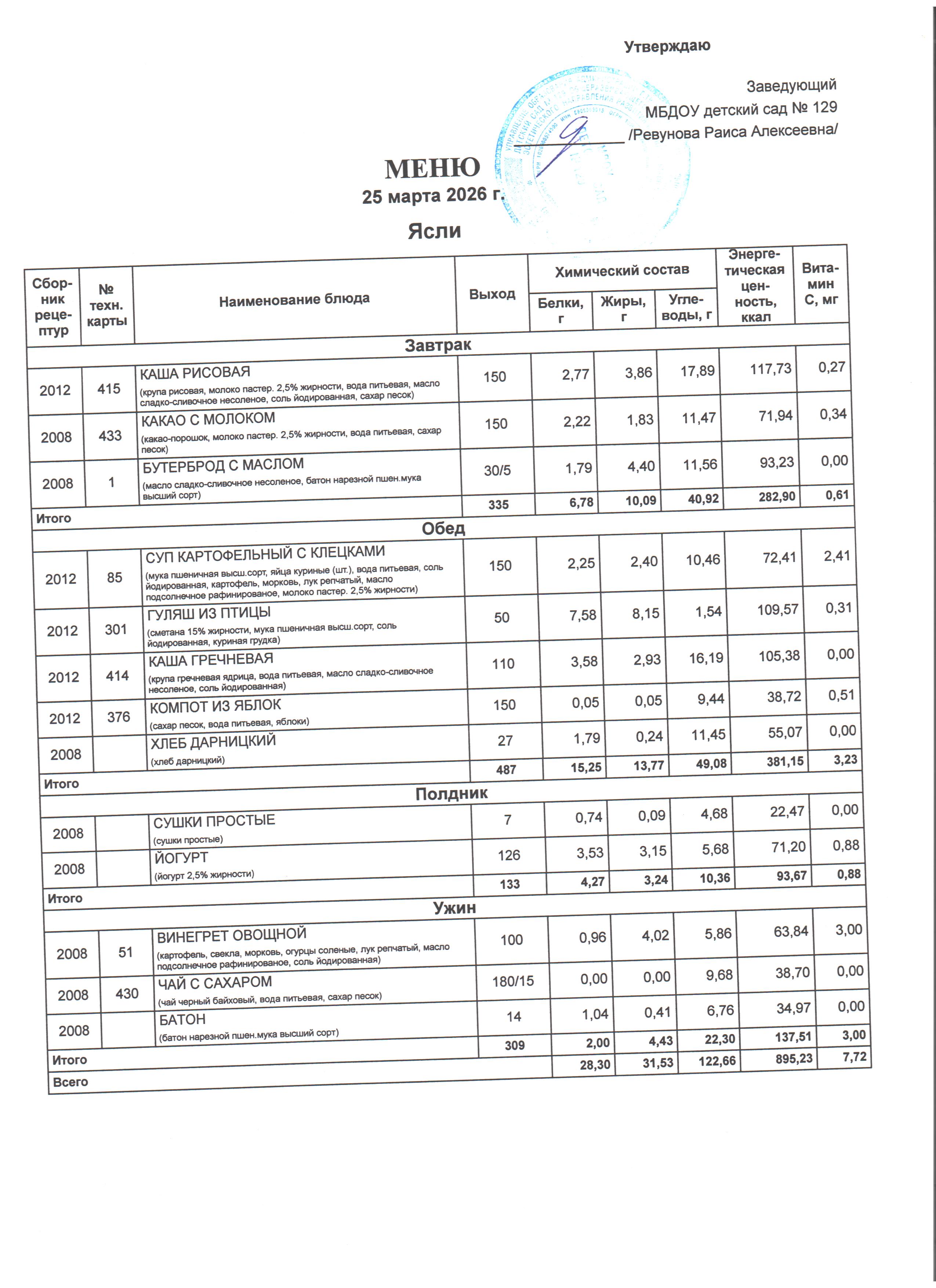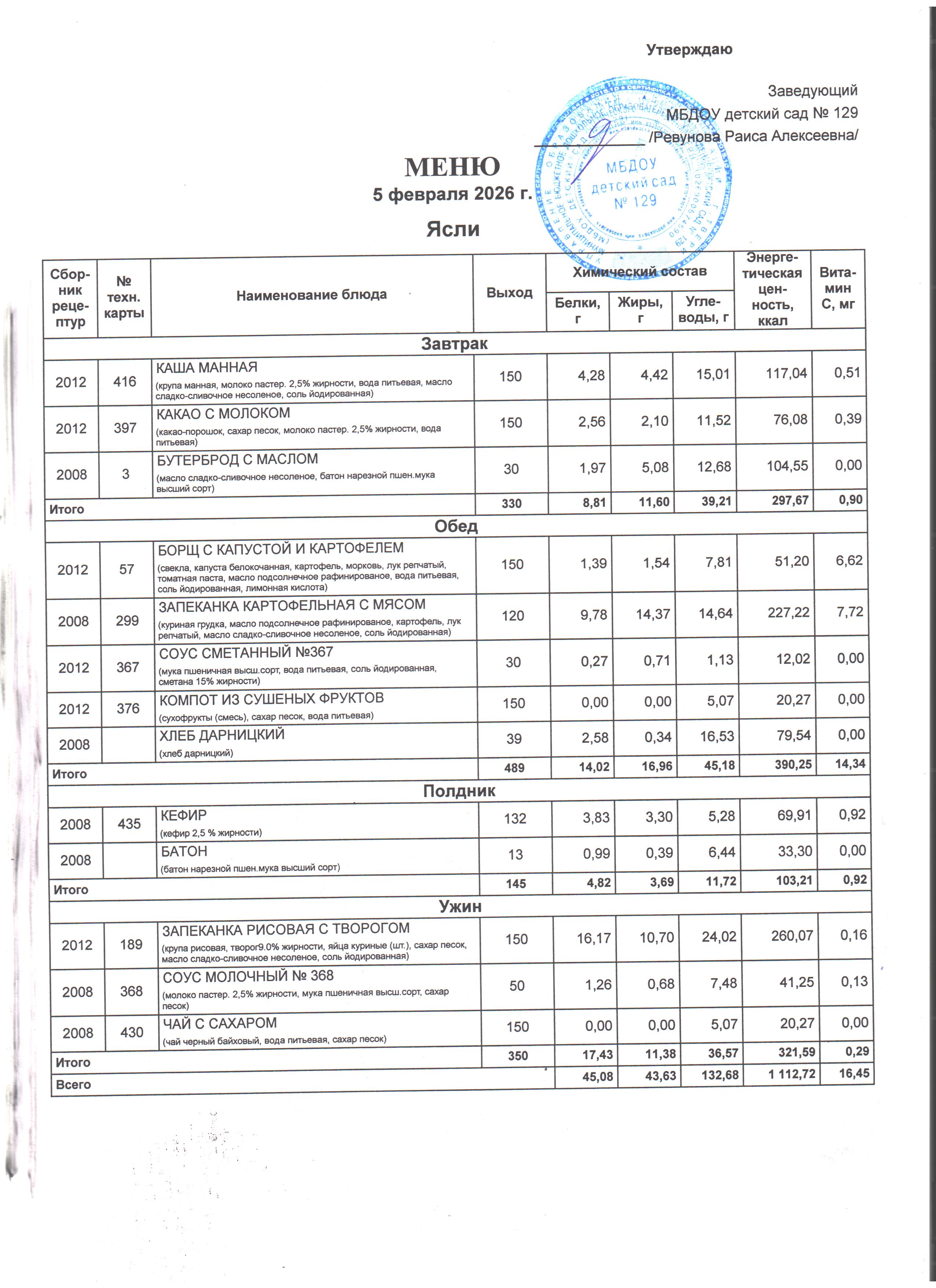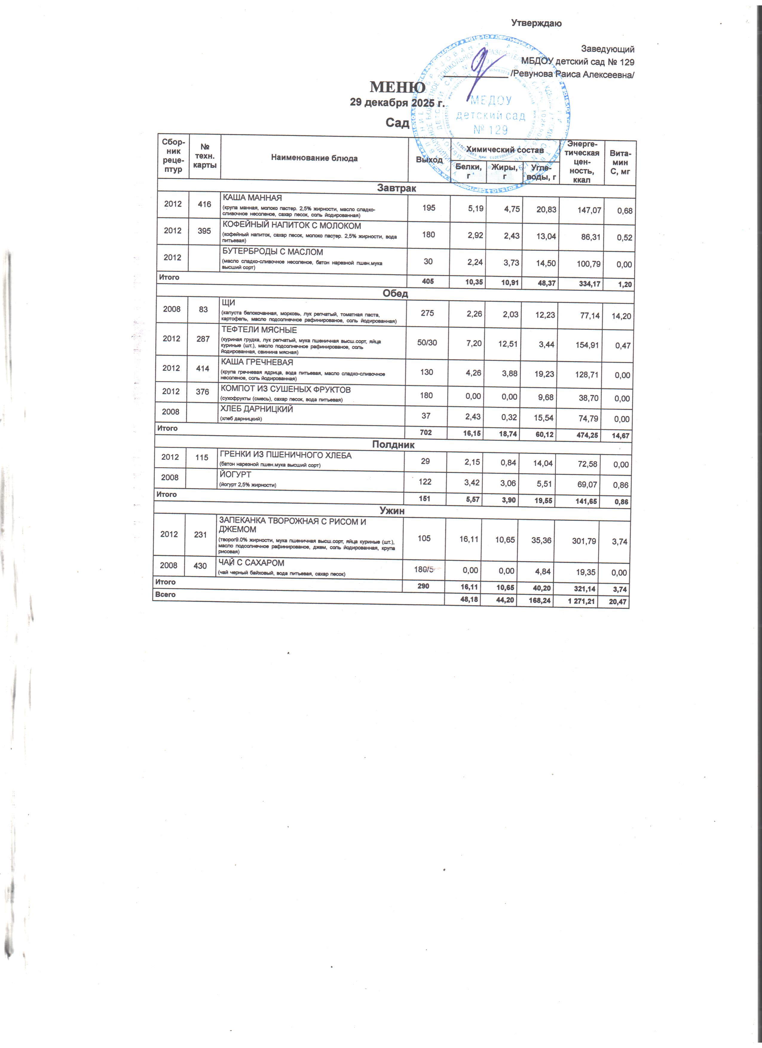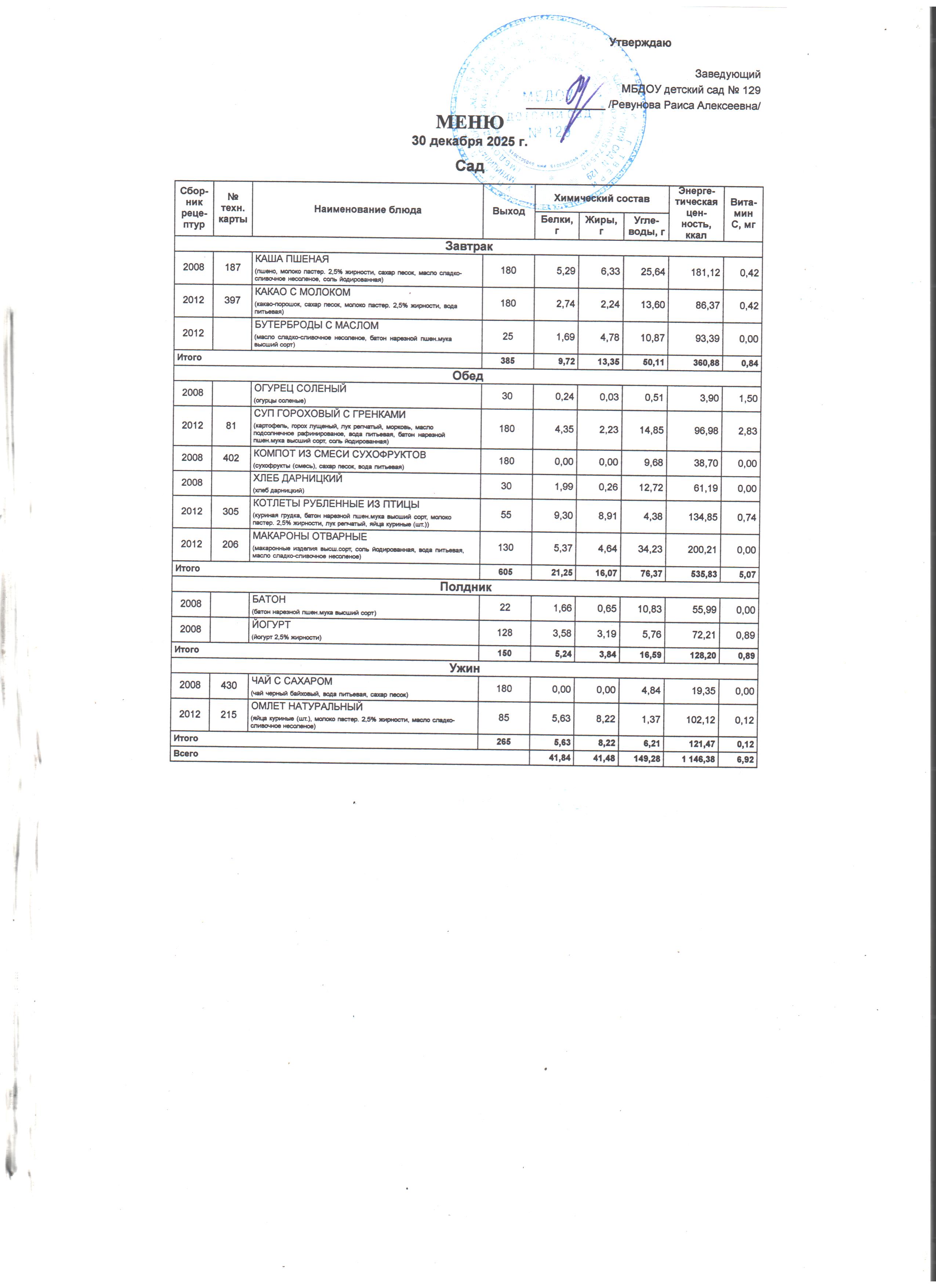 Специально составлена картотека технологических карт блюд, где указаны раскладка, калорийность блюд, содержание жиров, белков и углеводов, в соответствии со Сборником технологических нормативов, рецептур блюд и кулинарных изделий для дошкольных образовательных учреждений, рекомендованным Роспотребнадзором по Ростовской области. Даны рекомендации по организации 5-разового приема пищи (завтрак, второй завтрак, обед, полдник, ужин) при 12-часовом пребывании детей с сохранением суточного набора продуктов.