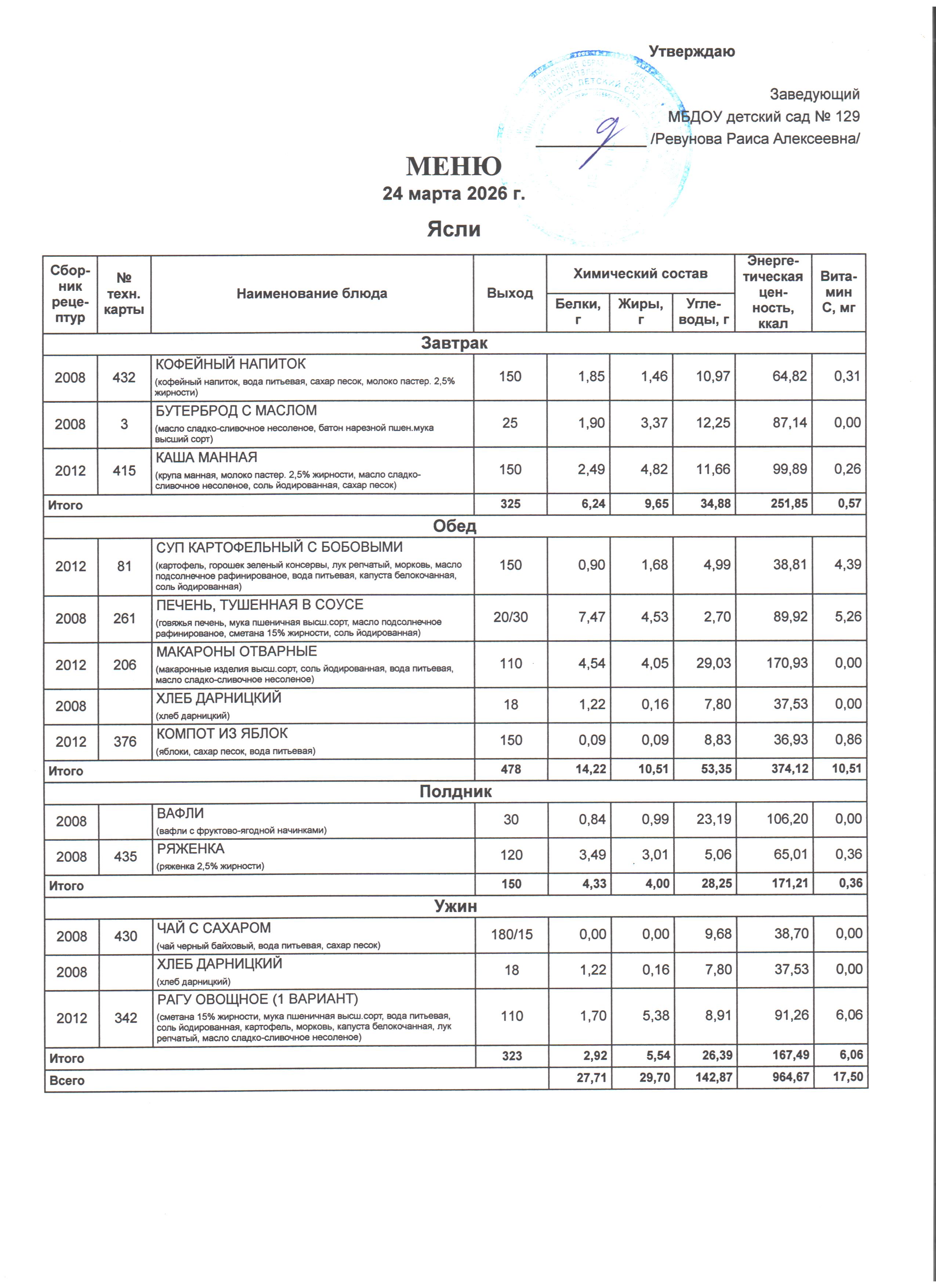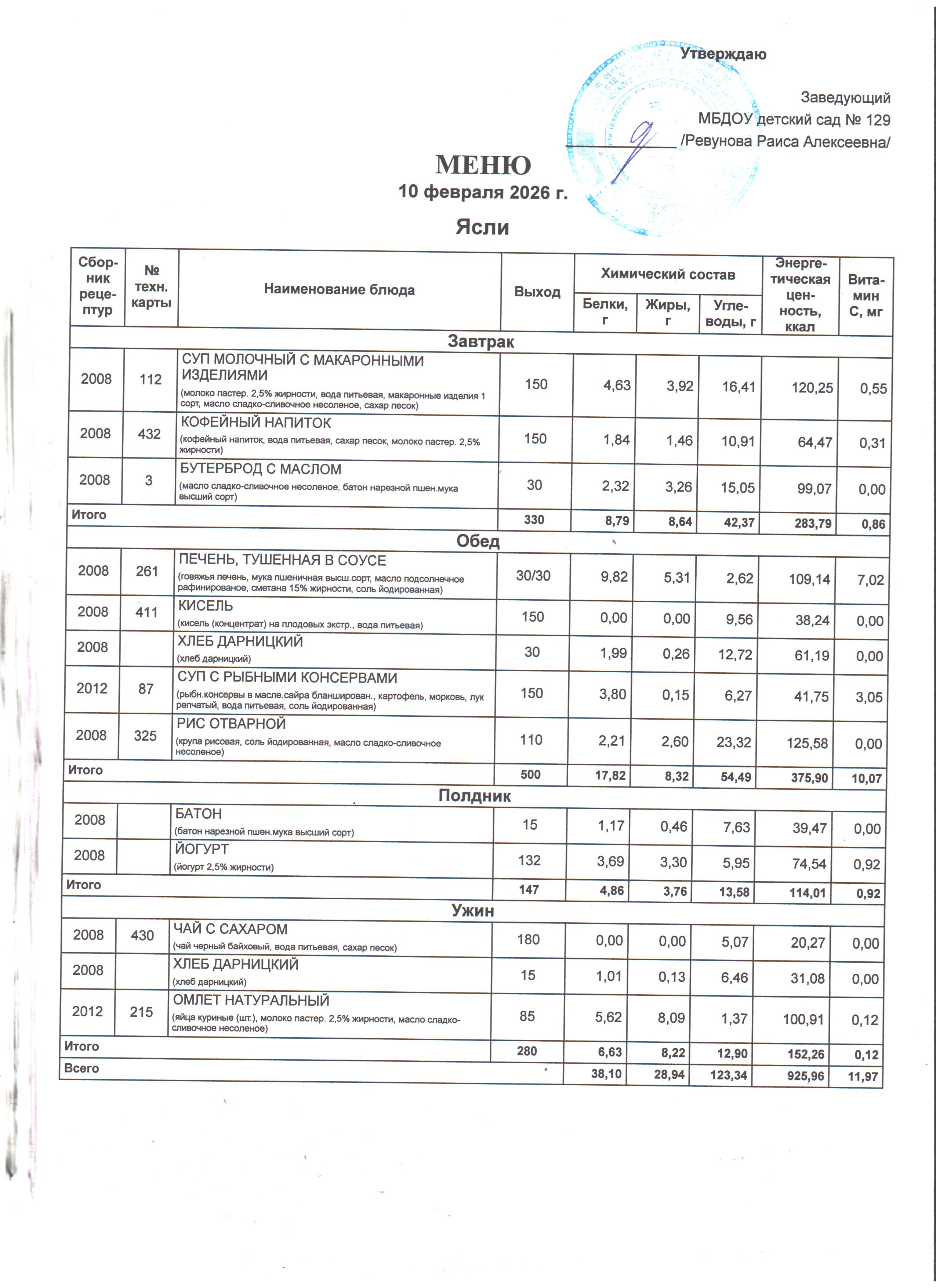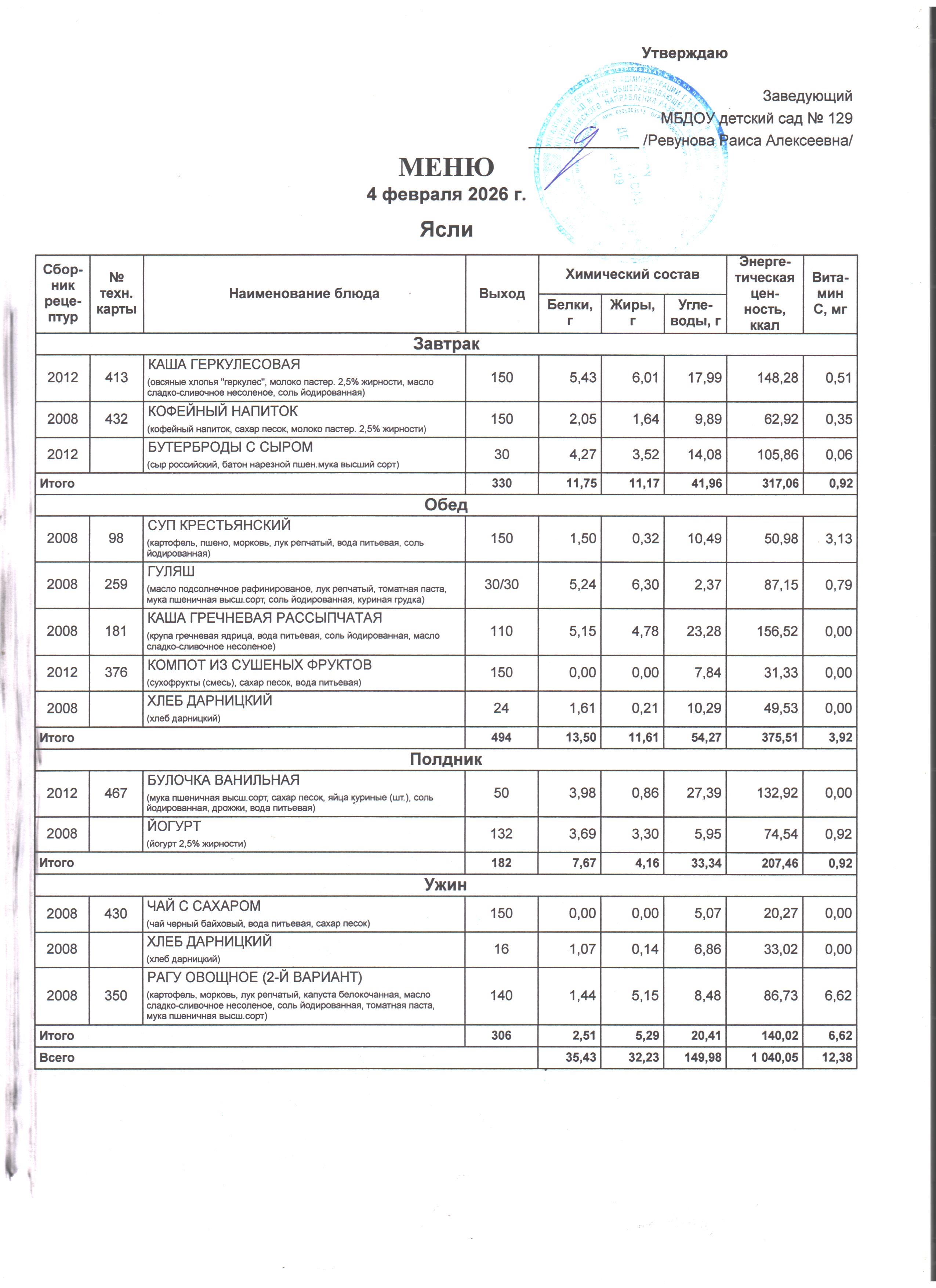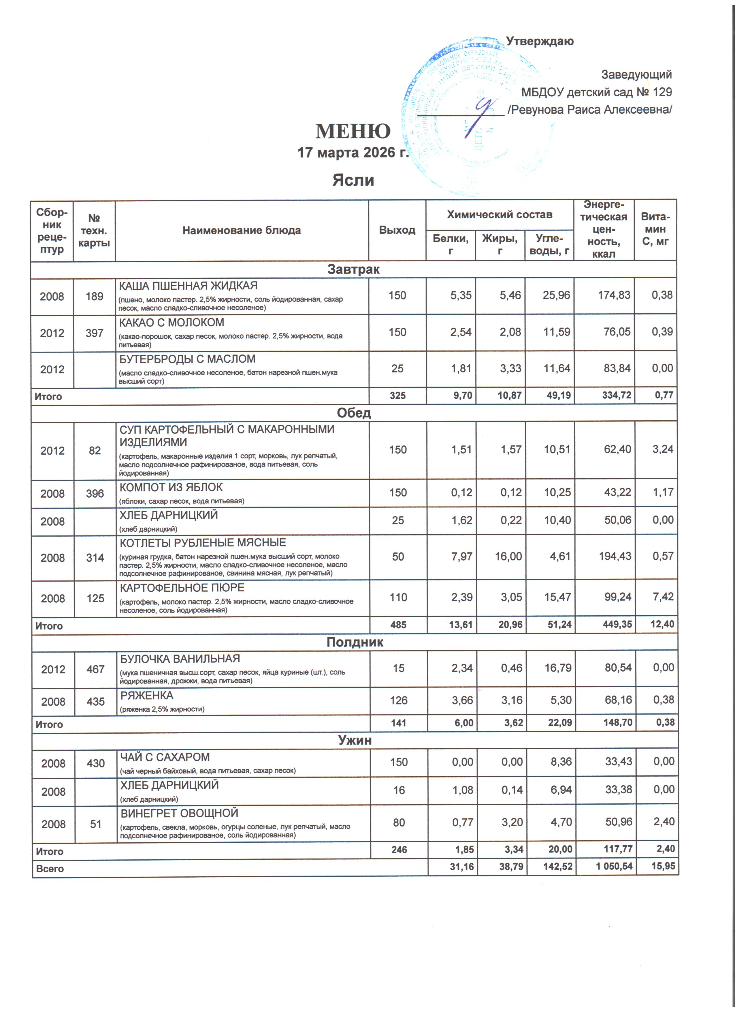 Специально составлена картотека технологических карт блюд, где указаны раскладка, калорийность блюд, содержание жиров, белков и углеводов, в соответствии со Сборником технологических нормативов, рецептур блюд и кулинарных изделий для дошкольных образовательных учреждений, рекомендованным Роспотребнадзором по Ростовской области. Даны рекомендации по организации 5-разового приема пищи (завтрак, второй завтрак, обед, полдник, ужин) при 12-часовом пребывании детей с сохранением суточного набора продуктов.